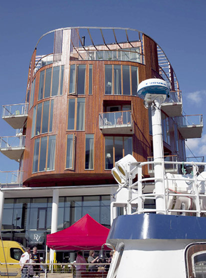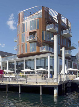 Hotel or suitetel on top of a restaurant and a bar on the turning point between the city fabric and the laguna/ bay water area this elliptic shapemark the center of the city. In the colours of the shark (fishing boat used in the area), white and lacked wood. This shape also gives grand viewlines from the individual rooms, all rooms.